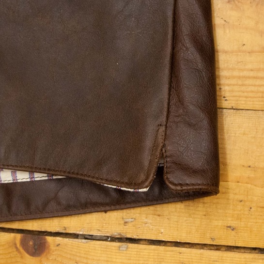 A Shackleton made by an apprentice at the begining of their training. There are stitch holes throughout the jacket with untidy stitching in the neck lining as well as some pleats in the lining on the side seam. The chest pocket leather is a slightly different colour to the rest of the jacket but this will blend in with wear- see pictures (Priced accordingly)