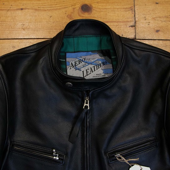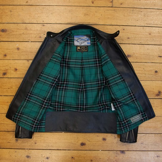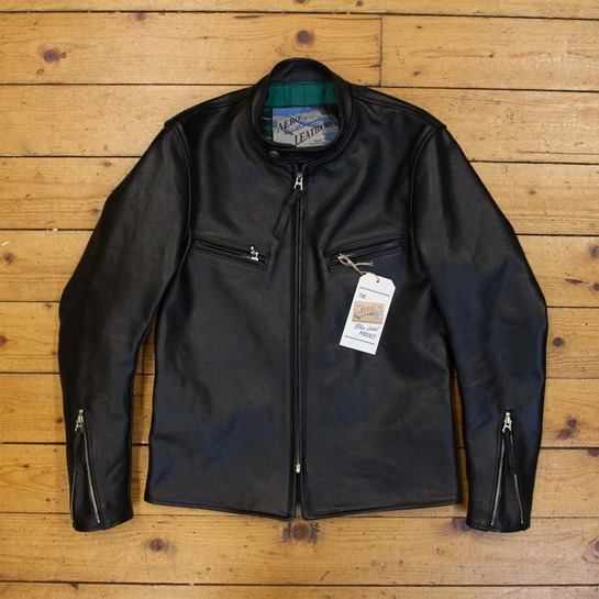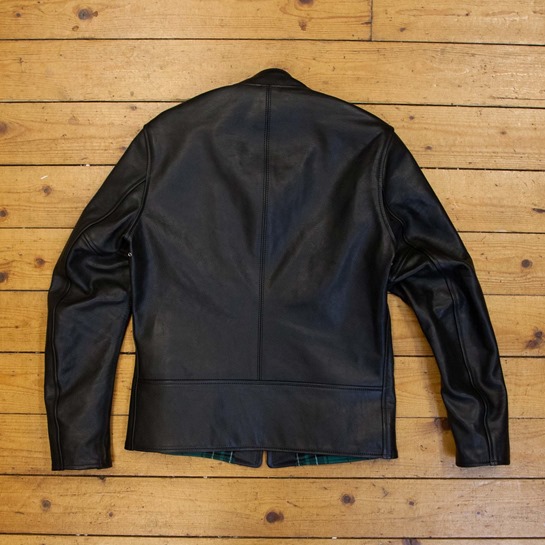 A test of a new Board Racer pattern with a few issues; the leather has some bunching around neck, and the front hem pokes out at little at the centre point. There is the odd natural mark and varying grain as to be expected with a Blue Label- see pictures.
