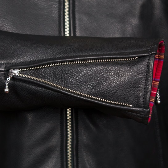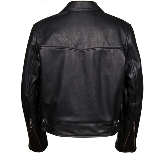 Our version uses ball and chain zippers in the two side pockets and like most versions of the original we've used the same zippers in the cuffs. For a neater look these are fitted in the seam rather than in the more common position in middle of the top sleeve, we've used pronged side buckles in an original 50's design, a proper recreation of the earliest of the original front zippers used by Rivetts which is top stitched in the old British style with the zipper teeth exposed and the classic double stitched collar with a sharp point. The fit of the jacket, although similar to the Aero Highwayman, is based on the Rivetts jacket, it's about 1" shorter than our famous version and is slimmer at the waist.