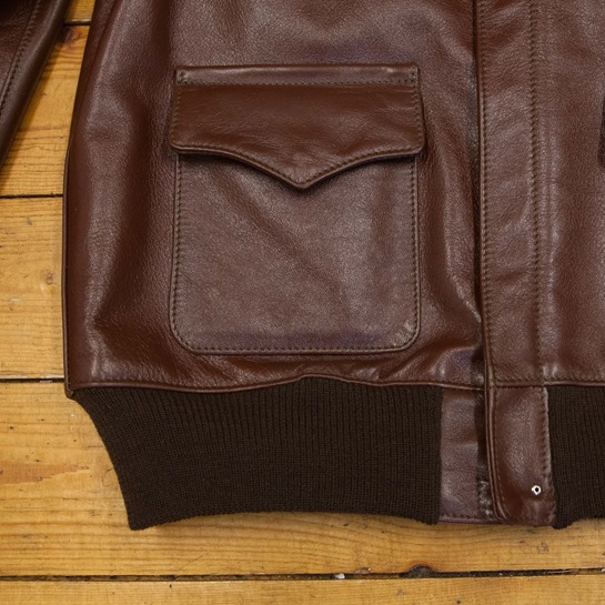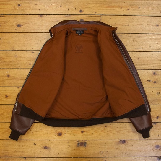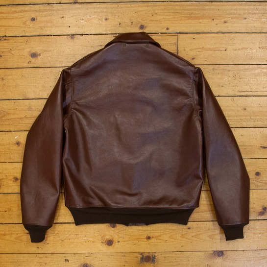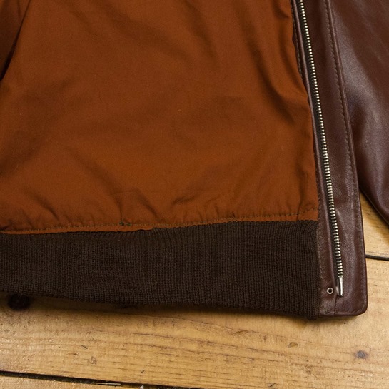 A good example of a Jerky Russet A-2 made for stock. Has a little bit of uneven stitching on the inner hem but is not visable from the outside. There is also a little bit of bunching around the knit but with wear this will be less noticable- see pictures. (Priced accordingly)
