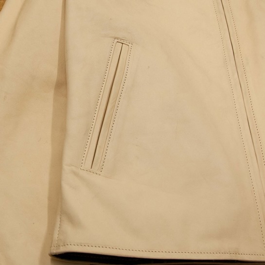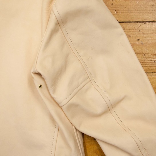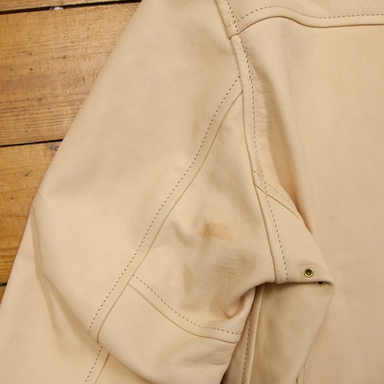 A Sheene jacket that has picked up some marks in the factory as pictured, this is due to the leather having no finish as is the nature of this leather. This makes it highly reactive to the elements and picking up marks. This will blend in to the character of the jacket with wear as it patinas. (Priced accordingly)